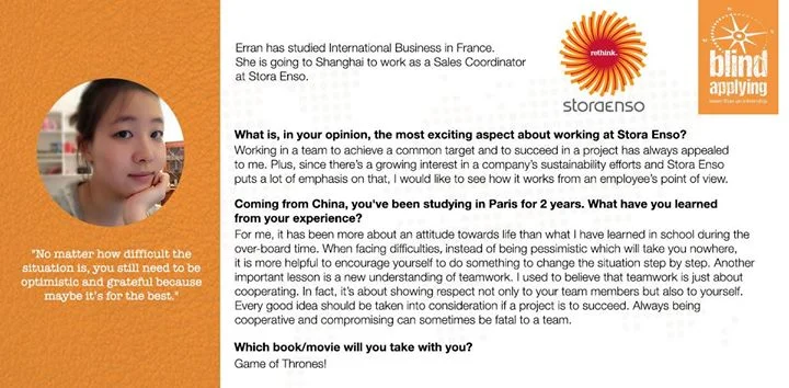 “Teamwork is about respect not only to your team members, but also to yourself”. Erran will soon be traveling to Shanghai to do her internship in Sales.